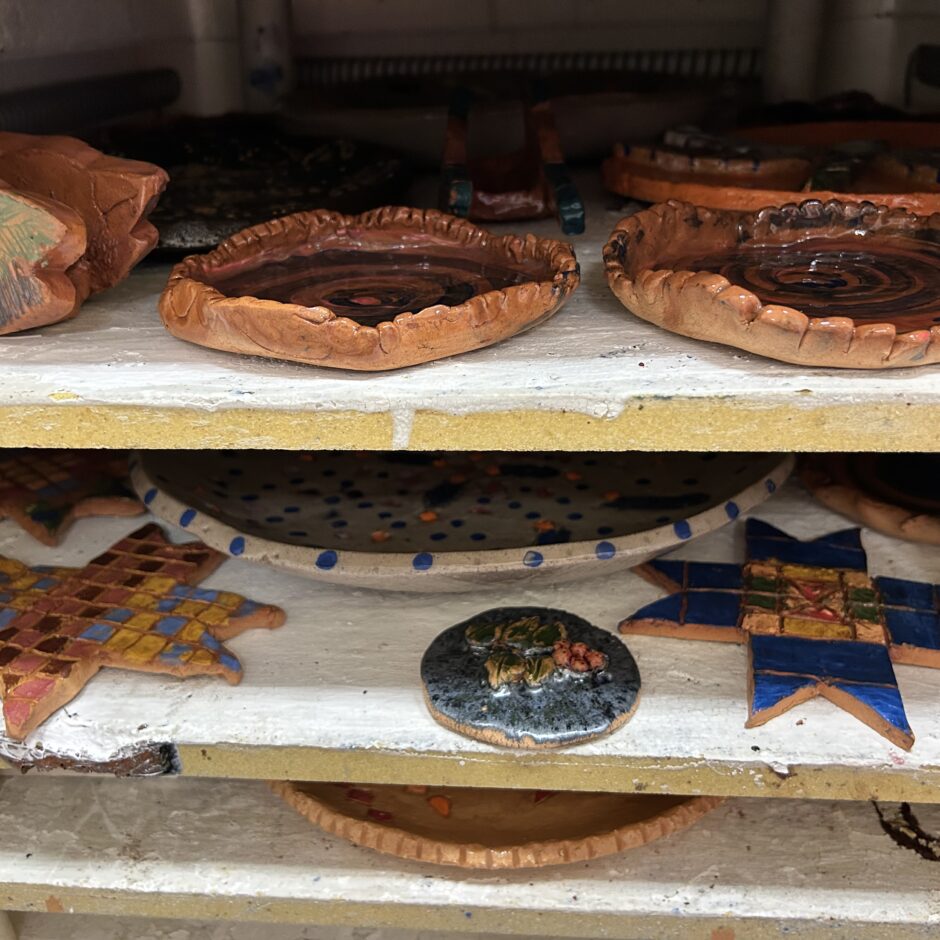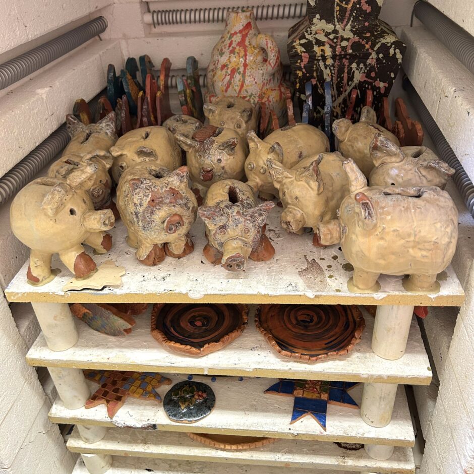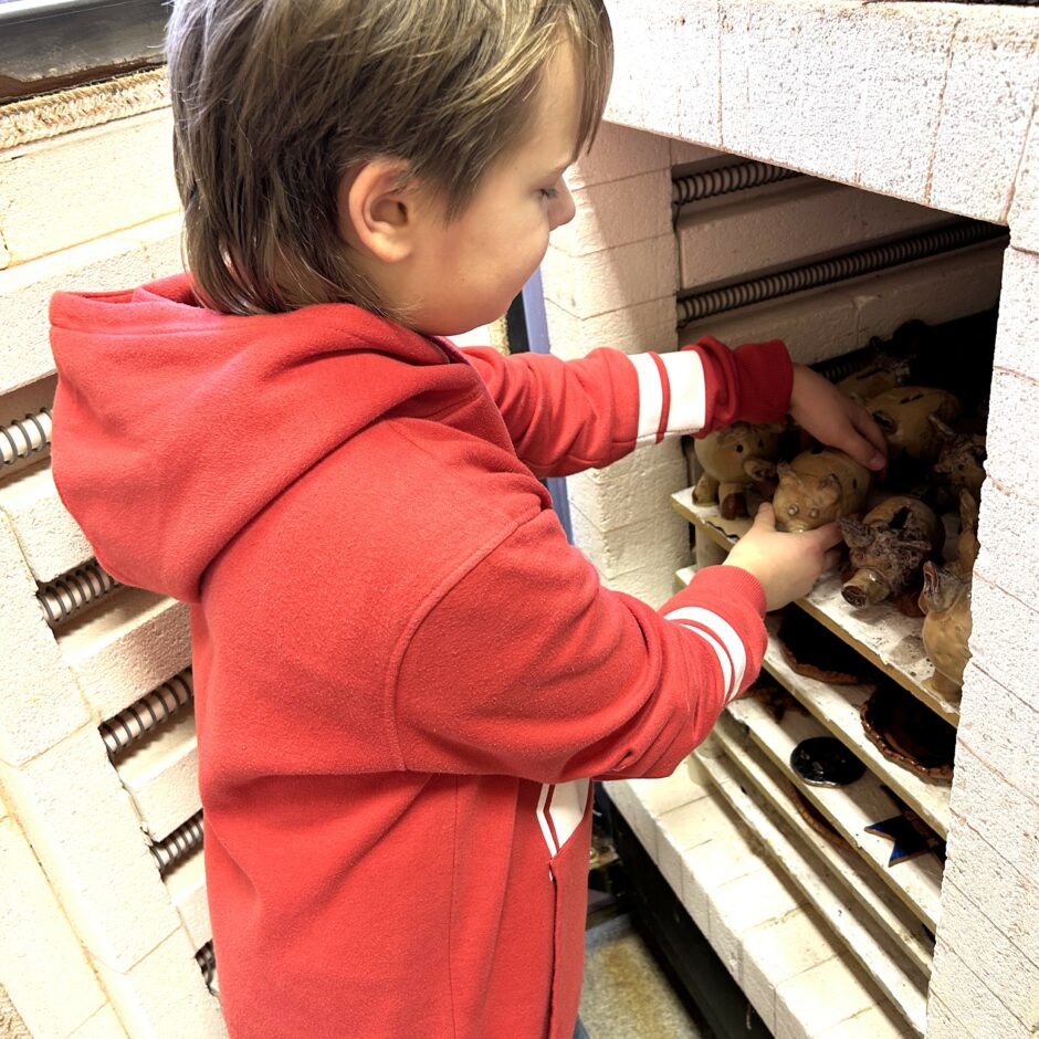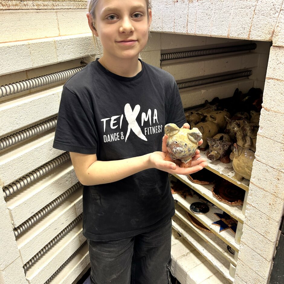 Keramikas nodarbībās vislielākais prieks un pārsteigums ir krāsns atvēršana, kad darbi ir izdedzināti ar glazūru. Savu krājkasi meklē Pauls Paķis un Tīna Tirzmala.